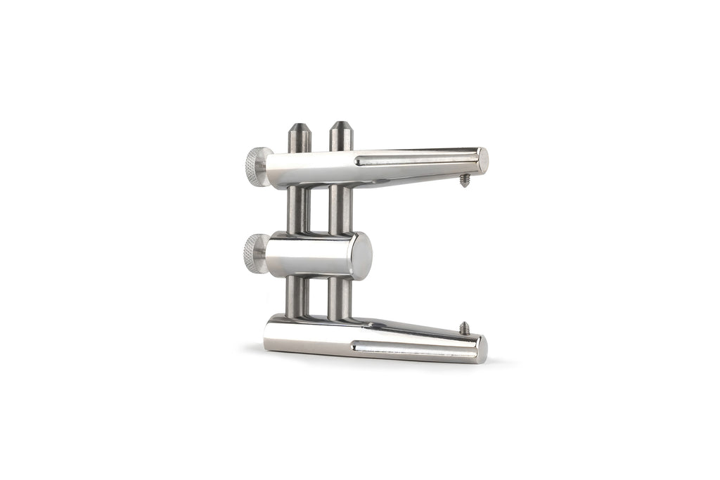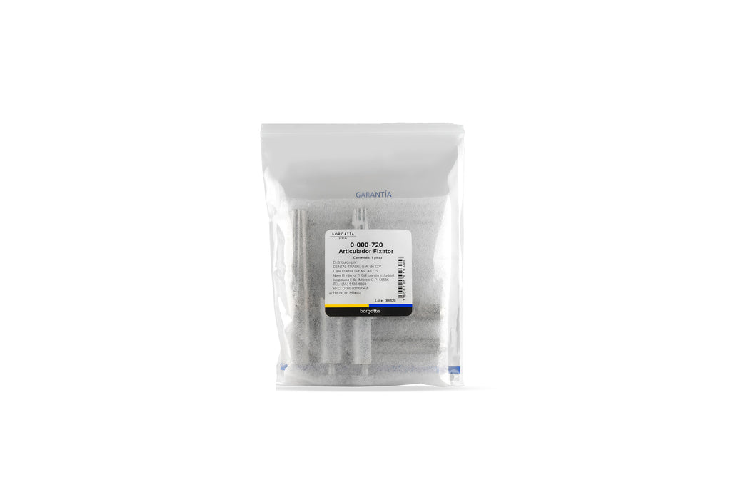 Preciso soporte de oclusión con brazos de fijación regulables, guías telescópicas que impiden algún desajuste del eje horizontal. Retención lateral para un montaje exacto y cierre oclusal que fija la oclusión vertical.