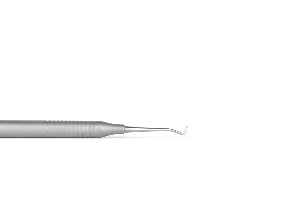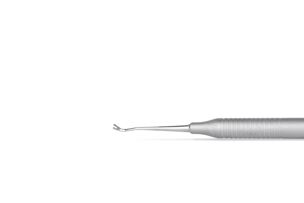 Instrumento dual, su punta bifurcada es ideal para asentar el arco en el fondo del slot.