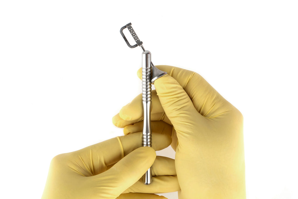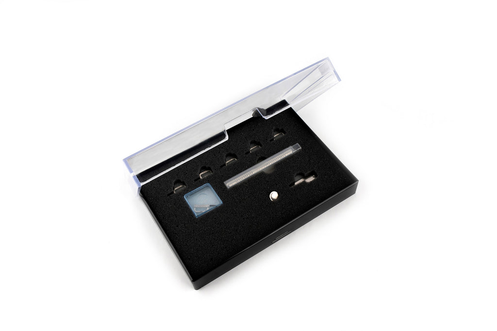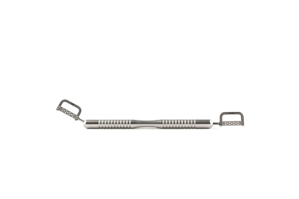 Cuerpo metálico, instrumento manual para realizar desgaste interproximal. Incluye medidor de espacios y pusher para intercambio de lijas.