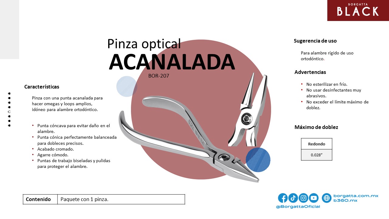 Pinza con una punta acanalada para hacer omegas y loops amplios, idóneo para alambre ortodóntico.