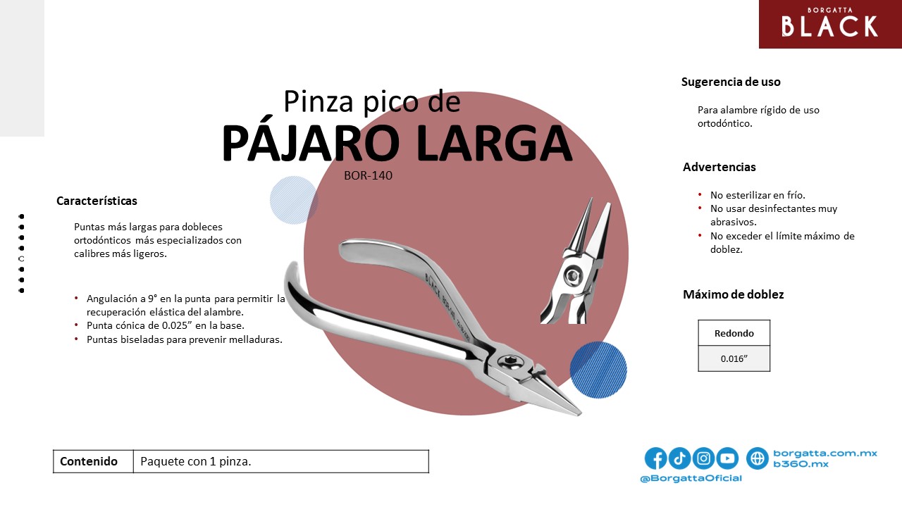 Trabaja con alambre redondo de hasta .016”. Puntas más largas para un doblado más fácil de alambres con calibres pequeños, punta cónica de .025” y una angulación de 9° para la recuperación elástica del alambre. Puntas biseladas con diamante para prevenir melladuras.