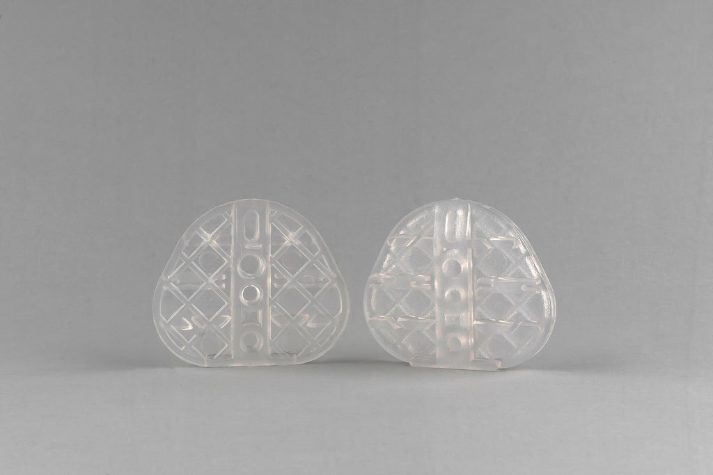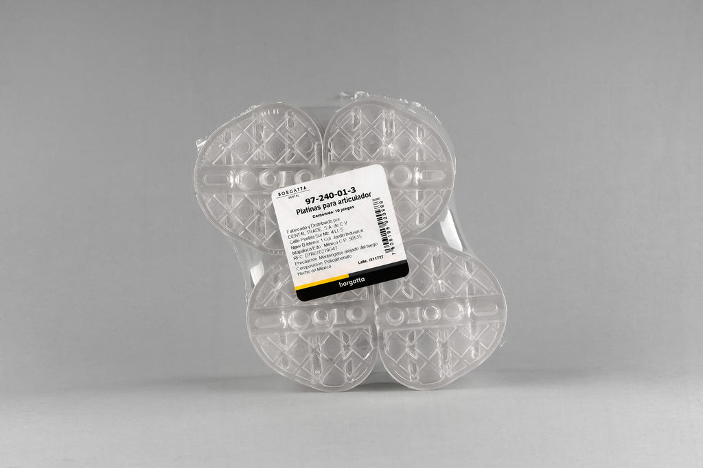 Cuerpo plástico translúcido con retenciones, que permiten una mejor adaptación al zócalo del modelo de estudio, compatibles con la mayoría de articuladores semi-ajustables que utilicen sistema de tornillo.