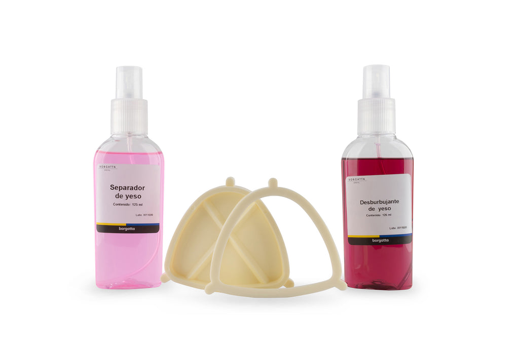 Contiene todo lo necesario para ejecutar un correcto y nítido “Split Cast” en el zócalo de los modelos de estudio: dos muflas de polietileno altamente resistente, un desburbujante y un separador de yesos.